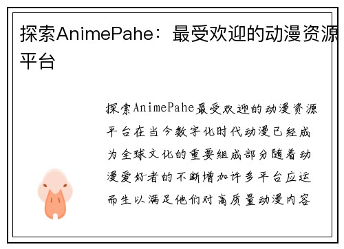探索AnimePahe:最受欢迎的动漫资源平台   在当今数字化时代,动漫已经成为全球文化的重要组成部分。随着动漫爱好者的不断增加,许多平台应运而生,以满足他们对高质量动漫内容的需求。其中,Anime...